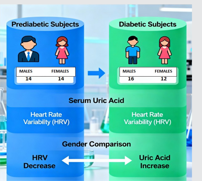 Our study really highlights the importance of catching cardiac autonomic neuropathy early in people with prediabetes and diabetes. We are using HRV[2,4] along with SUA as a possible predictive marker. By addressing high uric acid levels and autonomic imbalance early on, we could potentially protect cardiovascular health and enhance metabolic outcomes. What makes this study stand out is how it sheds light on the relationship between SUA, HRV, and gender differences within an Indian population.